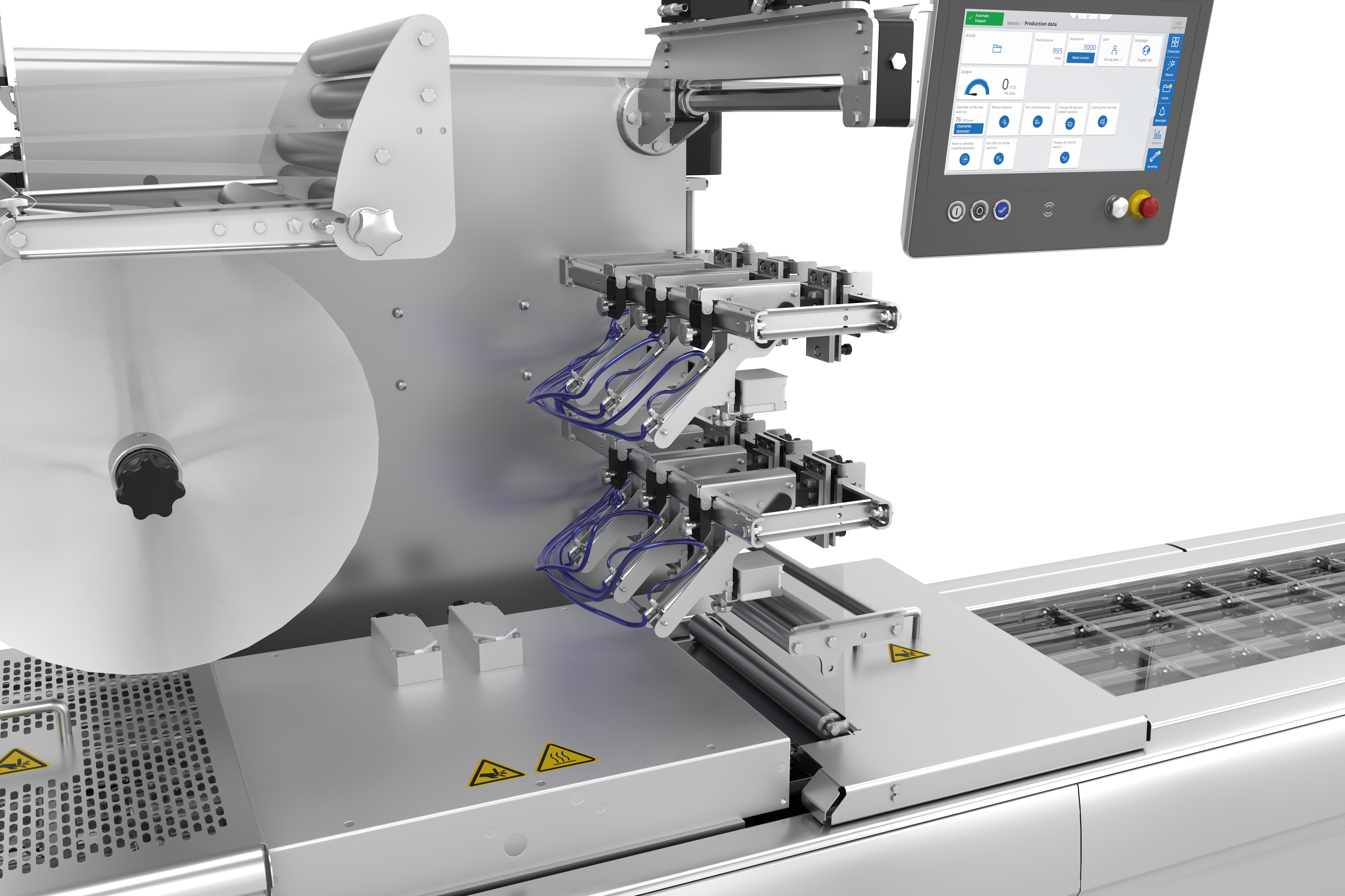 Para el marcado de envases termoconformados le ofrecemos dos soluciones de etiquetado personalizables, flexibles y plenamente integrables con etiquetadoras transversales e impresoras directas en lámina. El control de las etiquetadoras y de las impresoras directas en lámina tiene lugar de forma centralizada a través de la HMI (Human Machine Interface). Estaremos encantados de asesorarle sobre la selección de formatos y materiales.