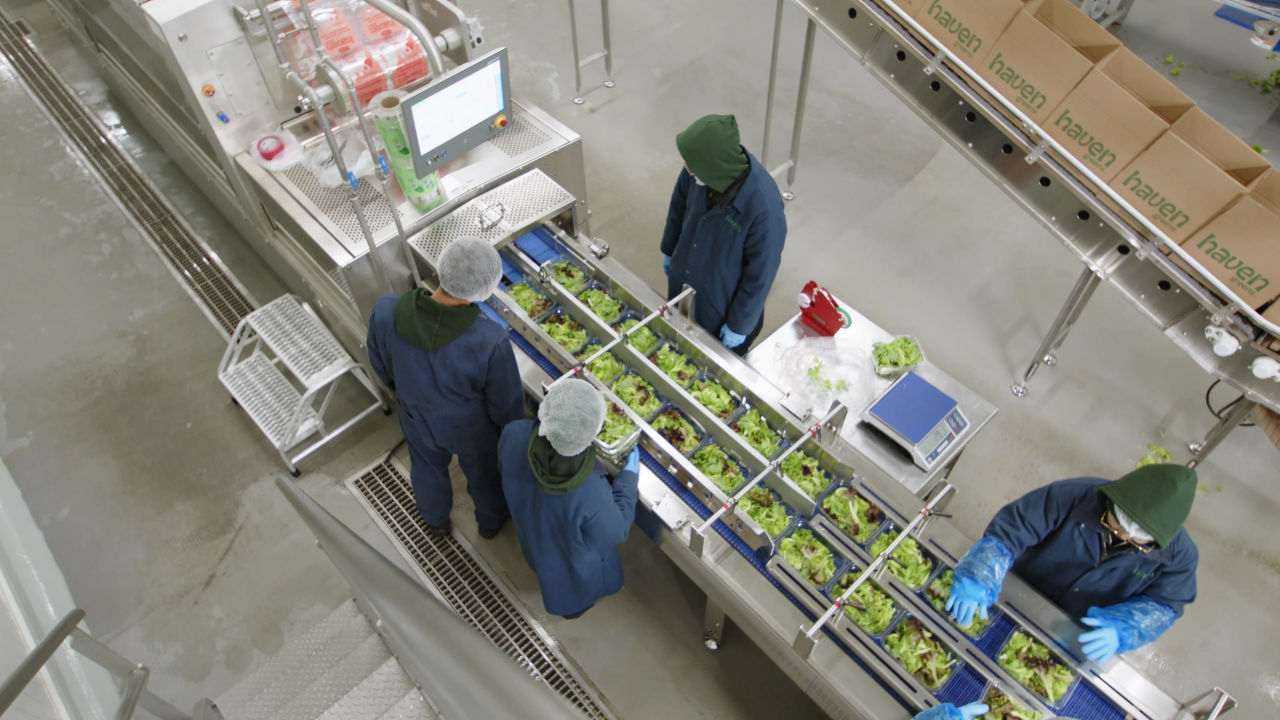 Haven Greens produit environ 10 500 livres de laitues chaque jour, 365 jours par an. Plusieurs variétés de jeunes pousses de laitue verte et rouge, ainsi que des laitues aromatiques, comme la roquette et la moutarde, sont cultivées et récoltées en une seule journée de travail efficace. Et comme la transformation se fait sur place, chaque feuille passe de la serre à la salle d’emballage dans un flux automatisé et continu.